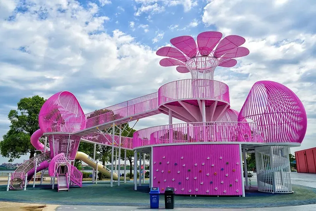 以含苞待放的花朵和花苞为原型设计,里面有着步梯、滑梯、攀爬墙、爬网、钻网、障碍穿行、梅花桩、“沙子动力工厂”等多元化的设备组合,增加娃们玩乐的趣味性和互动性。