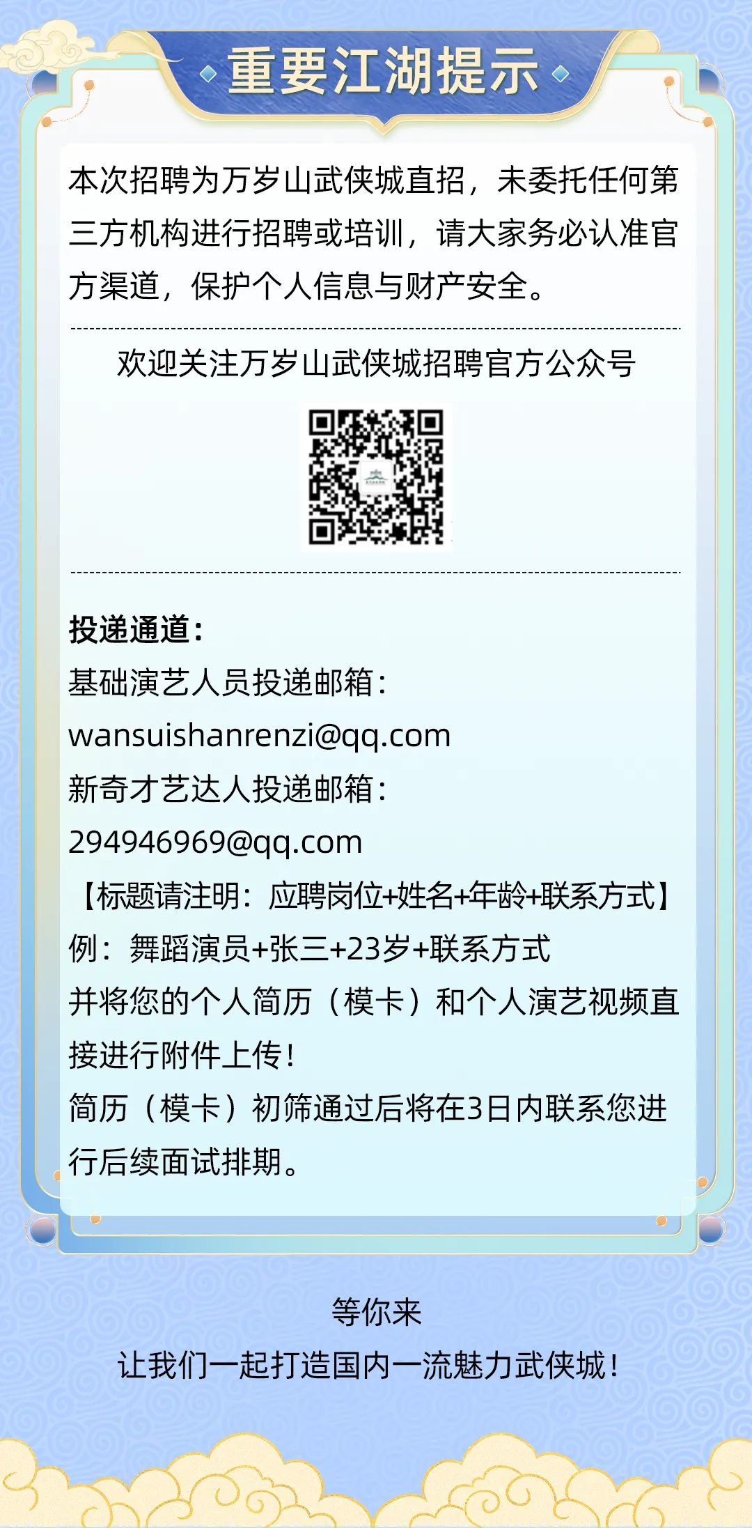 1月4日,河南万岁山武侠城景区发布演员招聘公告,具体如下:
