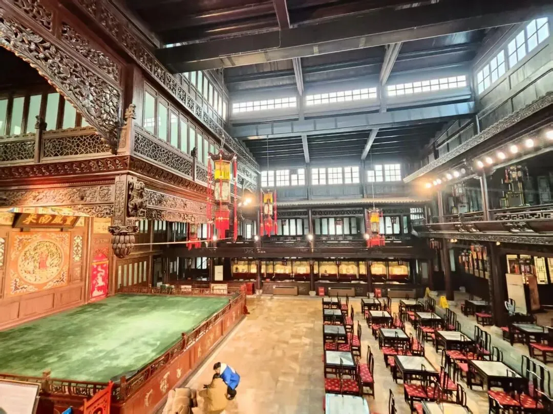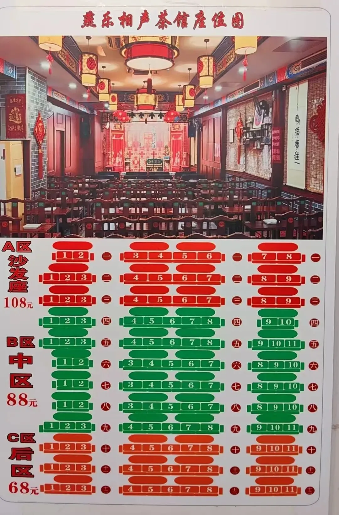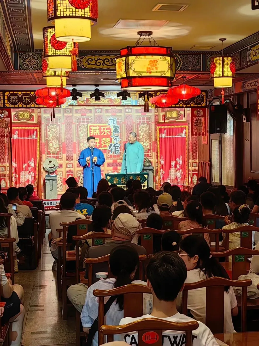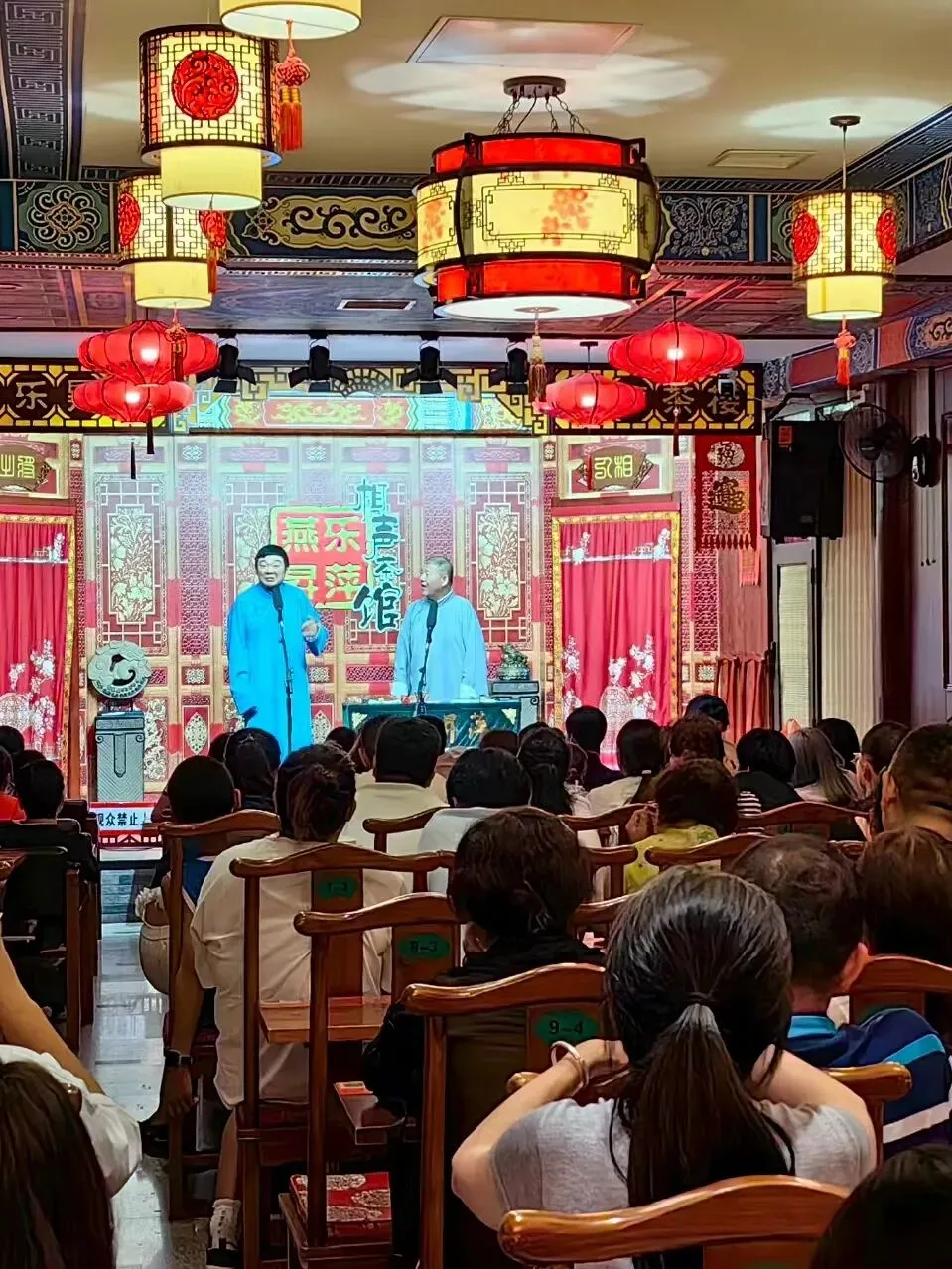 燕乐昇萍相声茶馆坐落于天津市南开区古文化街海河楼商贸区古文化街 99-4 号,作为承载着天津相声记忆的老场馆,燕乐昇萍的底蕴从踏入大门的那一刻便扑面而来。古色古香的装修与古文化街的青砖灰瓦相得益彰,木质桌椅整齐排布,暖黄灯光映照下,台上醒木、折扇、手绢一应俱全,演员身着传统长袍马褂,一开口便是地道的天津乡音,瞬间拉满怀旧氛围。这里没有华丽的舞台特效,却凭着最纯粹的曲艺表演打动人心,台下观众品着盖碗茶、嗑着瓜子,笑声、掌声与演员的妙语连珠交织,完美复刻了老天津茶馆相声的热闹场景。