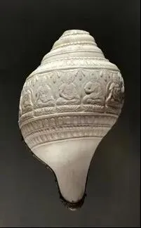 4、跨地域的文化传承:古印度时期海螺已被视作吉祥器物,佛教传入后纳入神圣象征体系,佛陀说法被比作“螺音清越”,可传遍十方;后续在西藏、中原等地佛教文化中,法螺逐步融入佛像背光、壁画、器物纹饰等艺术创作,强化了其在佛教文化中的核心地位。