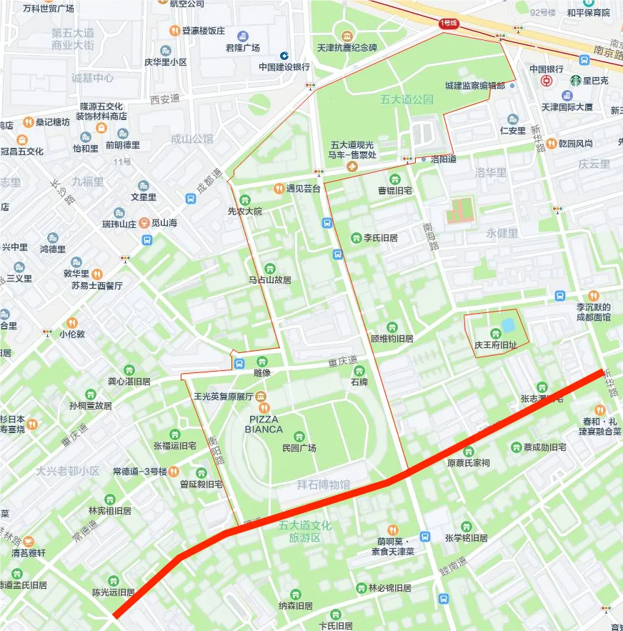 民园景区治安派出所以民园广场、五大道公园、先农大院、庆王府,以及大理道、河北路部分路段的路面、景区、临街商业、临街商铺等为主要辖区,由大理道(桂林路至新华路路段)、衡阳路、重庆道、长沙路、湖南路、成都道、南京路、新华路、洛阳道、河北路合围区域以及庆王府形成(附辖区示意图)。