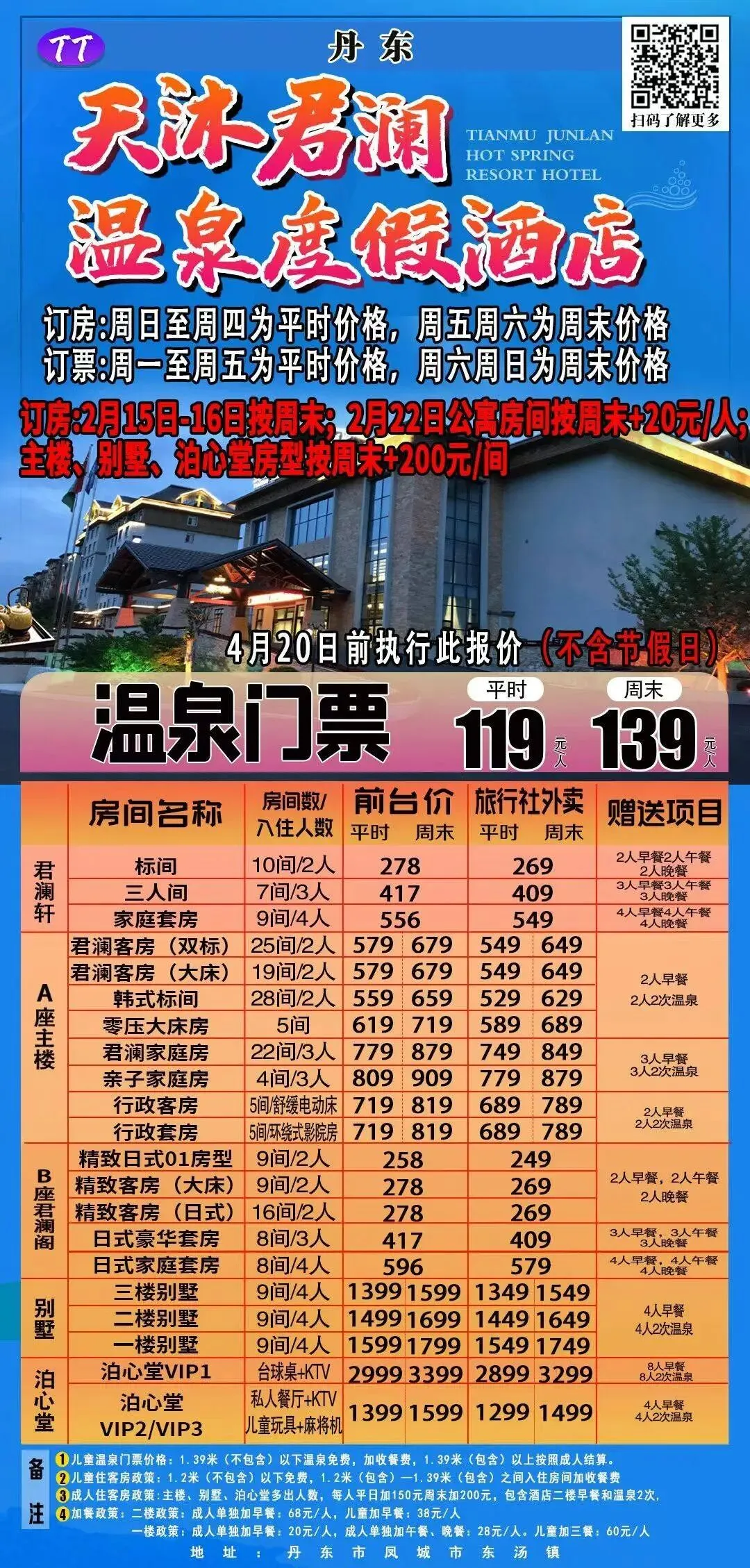 3⃣️东汤天沐君澜温泉度假酒店总占地面积5万平米,周边青山环绕、鸟语花香,环境极为惬意、自然。酒店客房共计200余间,在入住期间宾客可享受泡温泉两次,体验山水间别样的景色。酒店房型丰富,舒适典雅,能满足您的不同需求。置身天然氧吧于四季之中,尽享暖心之泉在山水之间。