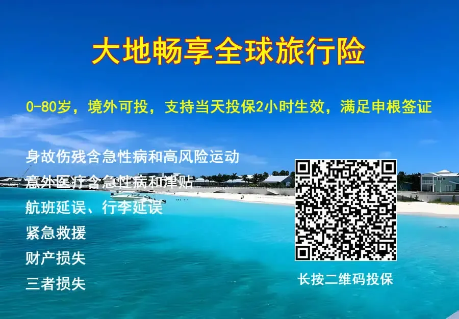 7、大地尊享全球旅行险:0-80周岁,4个计划,个人/企业均可投保,外籍可投,可团单,承保境内旅游及出境游,支持人在境外投保,支持投保当天2小时后生效,满足申根签证要求;覆盖探亲,陪读,商务,公务、工作、旅游,留学等,含高风险运动/航班延误/行李延误/紧急救援。