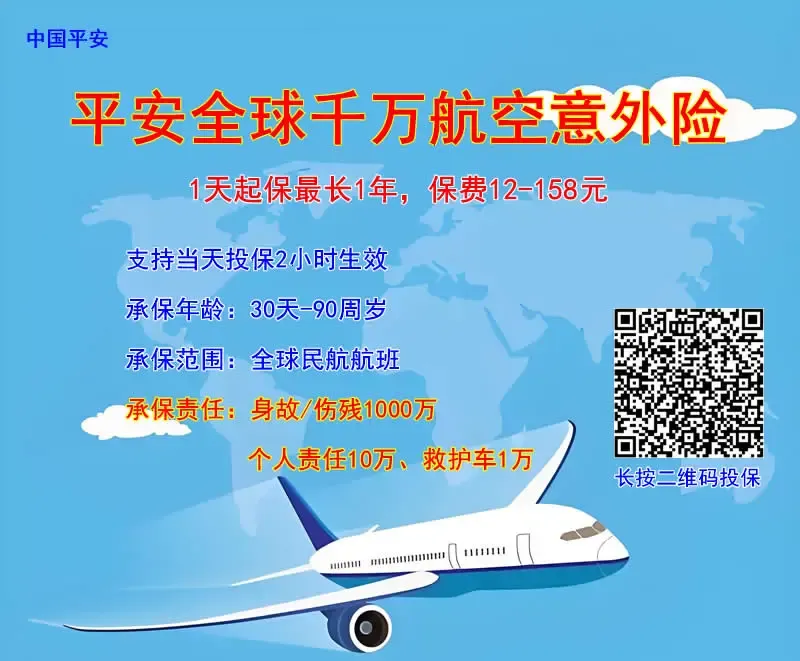 9、平安全球千万航空意外险:支持投保2小时生效,保期1天至1年,保费12-158元,身故/伤残1000万、个人责任10万、救护车1万