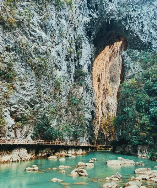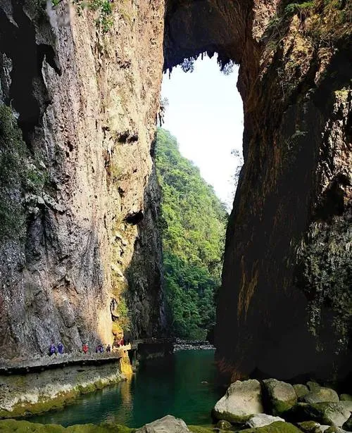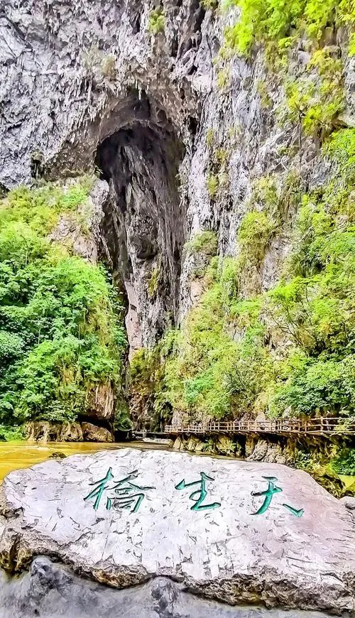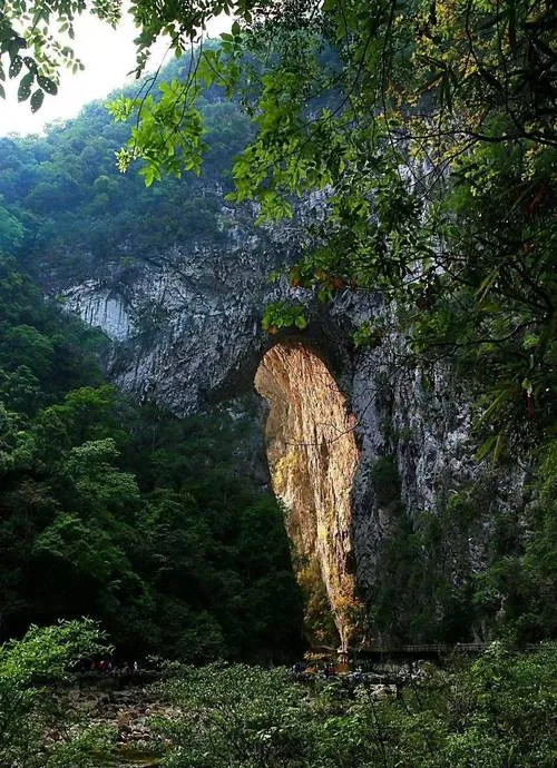第一眼就懂这座桥的名号,东方凯旋门不是夸,石灰岩被地下河掏出一个巨大穹窿,拱顶挂着钟乳石像古钟的舌头,拱口把天空切成一块蓝色圆盘,脚步轻一点,心里那点尘也被风卷走。