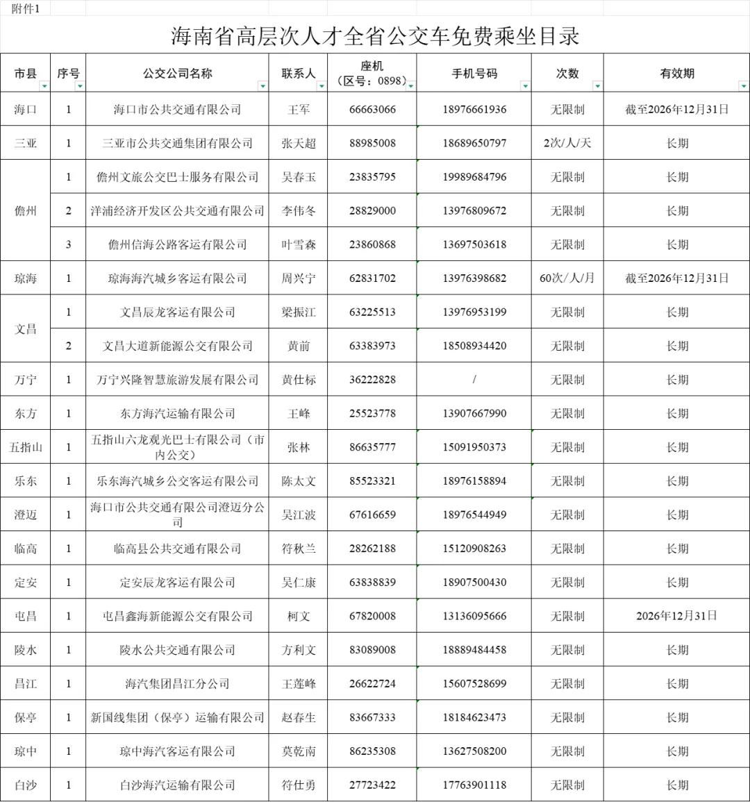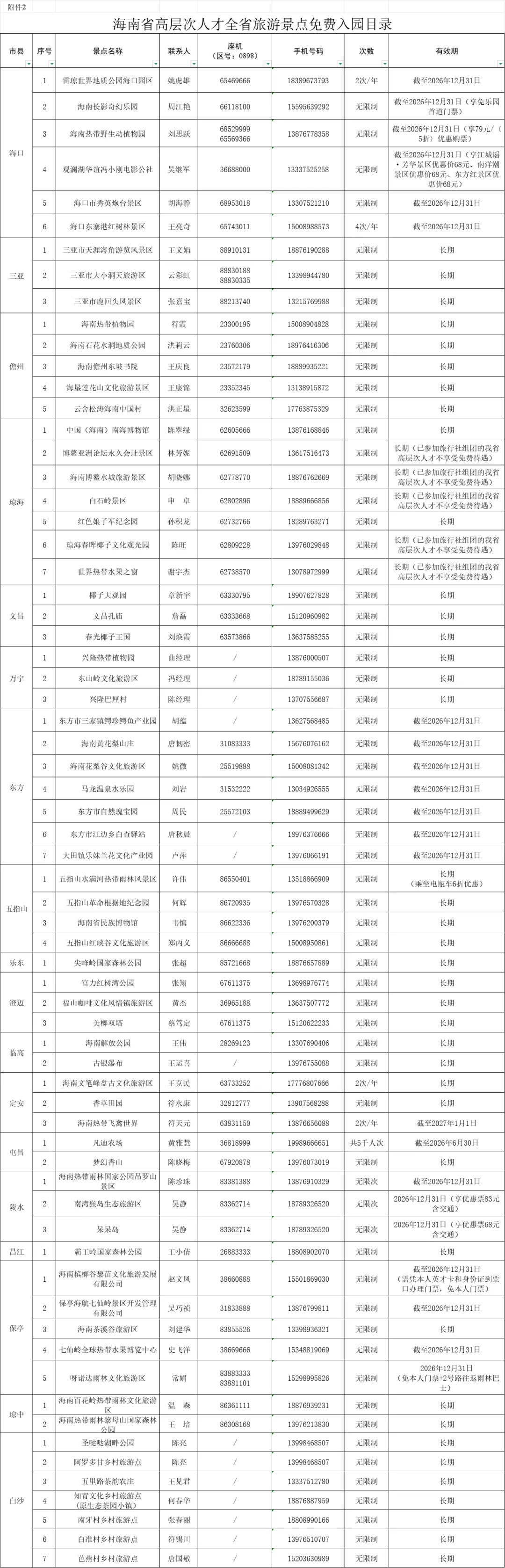 为进一步做好2026年高层次人才服务保障工作,现将《海南省高层次人才全省公交车免费乘坐目录》《海南省高层次人才全省旅游景点免费入园目录》信息公告如下(详见附件)。在免费享受目录中乘车以及旅游景点入园服务时,请提前出示本人持有的“天涯英才卡”(有效期内)。