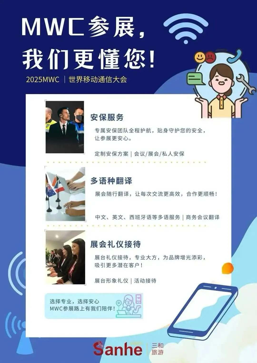 🌟无论是机场接机、展会出行还是城市观光,我们都能为您提供最贴心的服务!MWC期间,三和旅行社是您在巴塞罗那参会的理想伙伴!