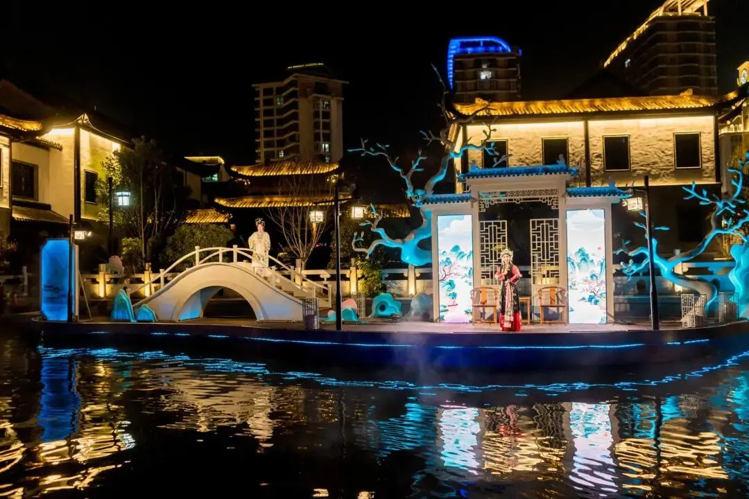 南公园水榭之上,拥有百年历史的“更俗剧场”被“搬”到水上。梅兰芳演绎的《嫦娥奔月》与欧阳予倩演绎的《宝蟾送酒》片段,在此精彩上演。