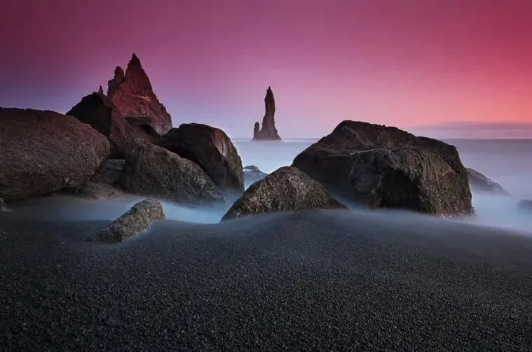 黑沙滩,其是火山爆发后冷却的黑曜岩被风化后所形成的沙滩。由于它黑得天然,黑 得通透,海水在丝毫未受影响的情形下依然清澈,在阳光下泛着金色的微光。进入黑沙滩有两个入口。其中一个是开到Vik后,从 Reynishverfisvegur转进去,这里可以看到整片的黑沙滩,还有一大排玄武岩组成的石头。