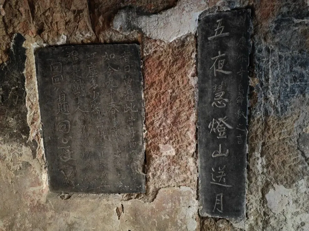 南、北墙壁内,深嵌3块石刻碑,其中,一块方碑上刻有两首诗,上面一首为:昔日曾游此,如今九十春。红尘多少客,谁是识予人。落款“回回翁”。紧接着下面一首为:昔年此地我曾来,事满华夷遍九垓。无赖虬蛟识吾面,使我踪迹不沉埋",落款“回公再书”。后人从单字两口与回字两口解读出“吕”字,认为是吕洞宾所作。