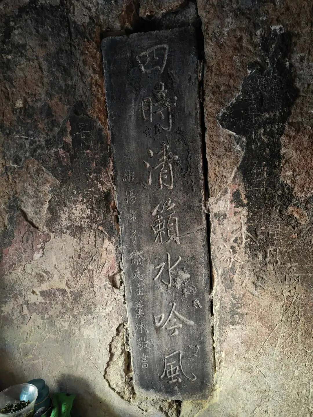 另外两块碑上刻一副对联,南墙碑上为上联:五夜慧灯山送月,旁边刻“康熙辛巳仲秋之吉”,康熙四十年(1701年)所书。北墙壁上为下联:四时清籁水吟风,落款:维扬弟子徐元圭熏沐敬书。这两句一静一动,将吕祖洞远离尘嚣的氛围烘托得淋漓尽致,系1701年,扬州信众徐元圭游览泰山时,被吕祖洞的清幽意境打动所书,流传至今。