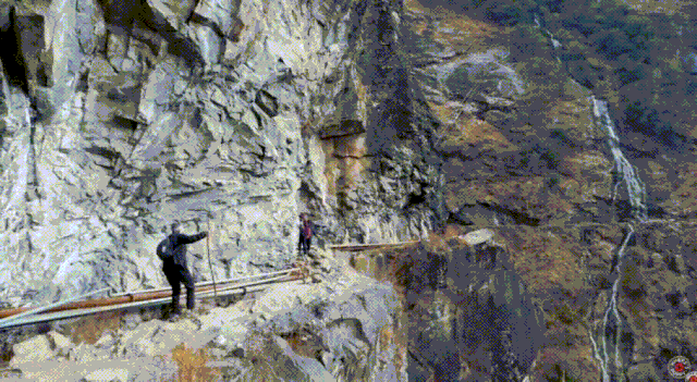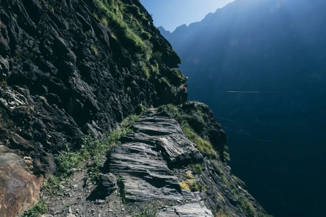 △位于上虎跳的28道拐 / 图虫创意 休整了一晚,爱德华决心来到中虎跳,这可不是让人拉家常的地方。 中虎跳,最最惊心动魄的一环,路窄且险,除了身体要贴着悬崖前进,也有山体几乎与地面垂直,必须借助梯子或者安全绳才能翻越。 爱德华显得有些驾轻就熟:“中虎跳才是虎跳峡的灵魂所在。有人走完上虎跳就结束,这真的很可惜,不过你一定得小心,据我所知不少人葬身于此。”