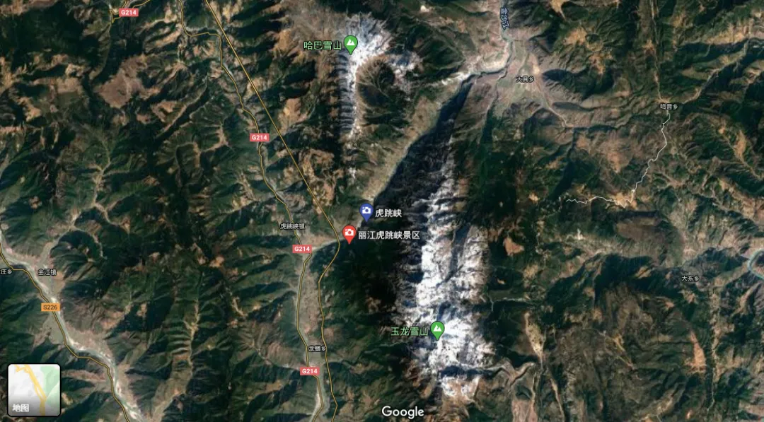 △虎跳峡 / 图虫创意 打开卫星地图,你会对虎跳峡大吃一惊: 奇,这竟处于长江的源头河段。 当发源于青藏高原的怒江、澜沧江纷纷选择南下时,只有金沙江在云南境内的石鼓镇掉头,咆哮而过虎跳峡的最窄处,最终形成我们的母亲河——长江。