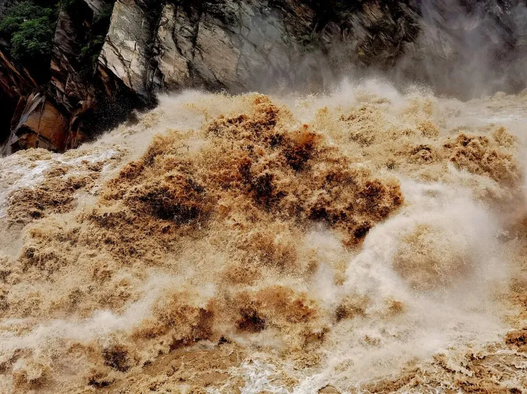 当金沙江被骤然收窄至30米,短距离216米的落差,连跌7个陡坎,自然收不住磅礴之势,如虎长啸,仿似天上震掉跌落的滔滔黄水。