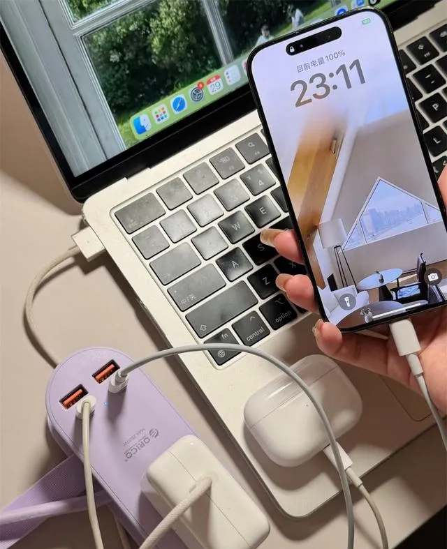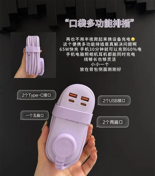 现在出门,手机、耳机、相机、手表……一堆要充电的。酒店的插座数量,基本上没一次让我满意过。要不太远,要不被家具挡住。后来我专门买了个口袋型多功能插排,轻巧得很,能插USB、Type-C、普通插头。每次插在桌上,所有设备一块充,收拾东西的时候一卷就走。之前有朋友抱怨酒店东西落下,我说你用插排,把所有东西都集中一处,走的时候一眼就能看全,啥也不会忘。