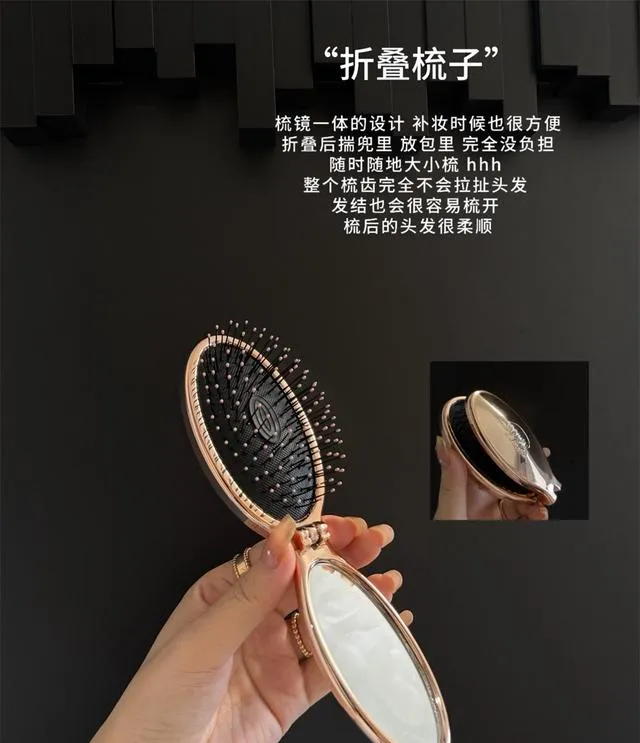 梳子这个东西,尤其女生出门,绝对不能省。我家那位原来图省事用酒店一次性梳子,头发越梳越炸。后来我给她买了个折叠梳,带镜子的那种,外出补个妆,头发打理,全搞定。关键是这梳子气垫设计,不拉头发,镜子展开还能当手柄用。等电梯的时候照一照,随手梳一梳,比带一堆小镜子强多了。
