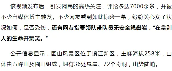 1月4日,短视频平台有网友发视频称,一女性游客在江苏镇江圌(chuí )山风景区野线攀爬时,疑似因体力不支脚滑,发生坠滑。