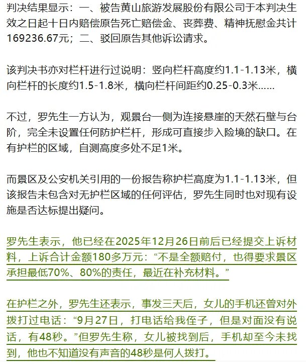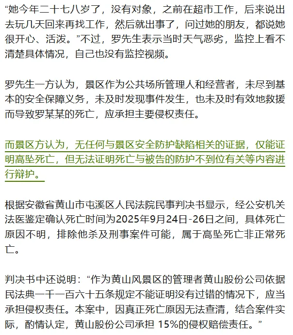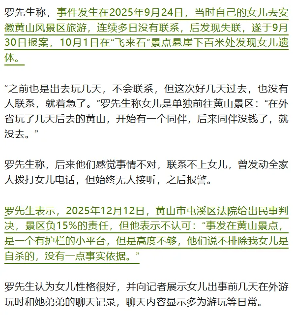 近日,湖南永州的罗先生反映,自己的女儿于2025年9月在安徽黄山景区“飞来石”景点坠亡,当地法院民事判决书显示其女儿排除他杀及刑事案件可能,属于高坠死亡。