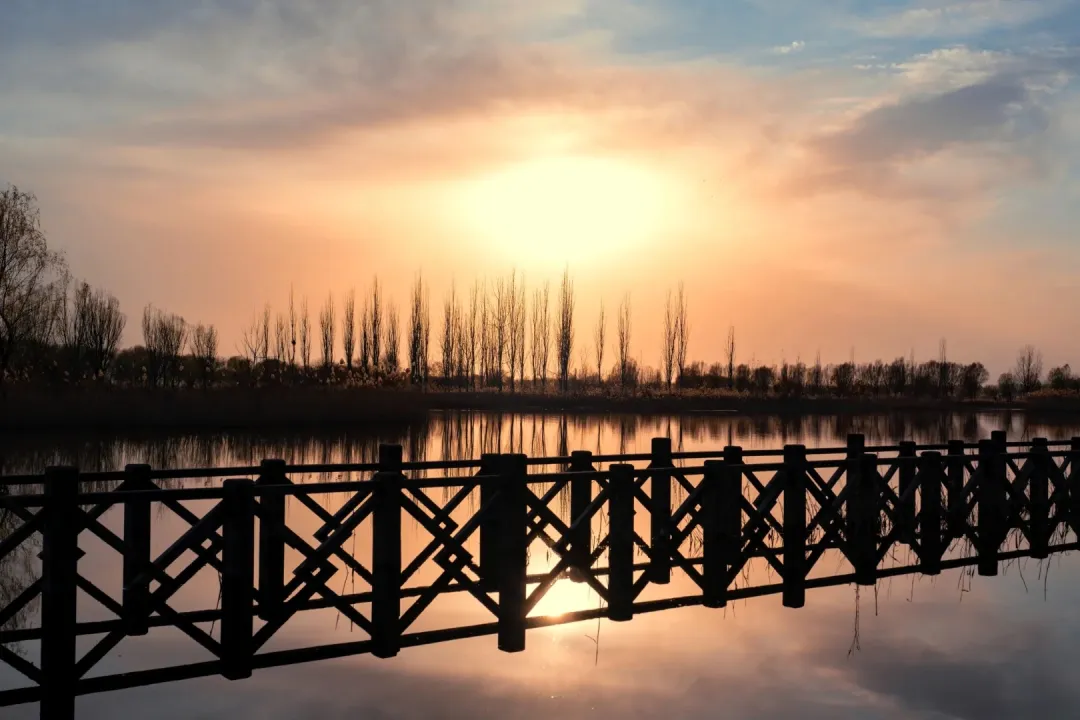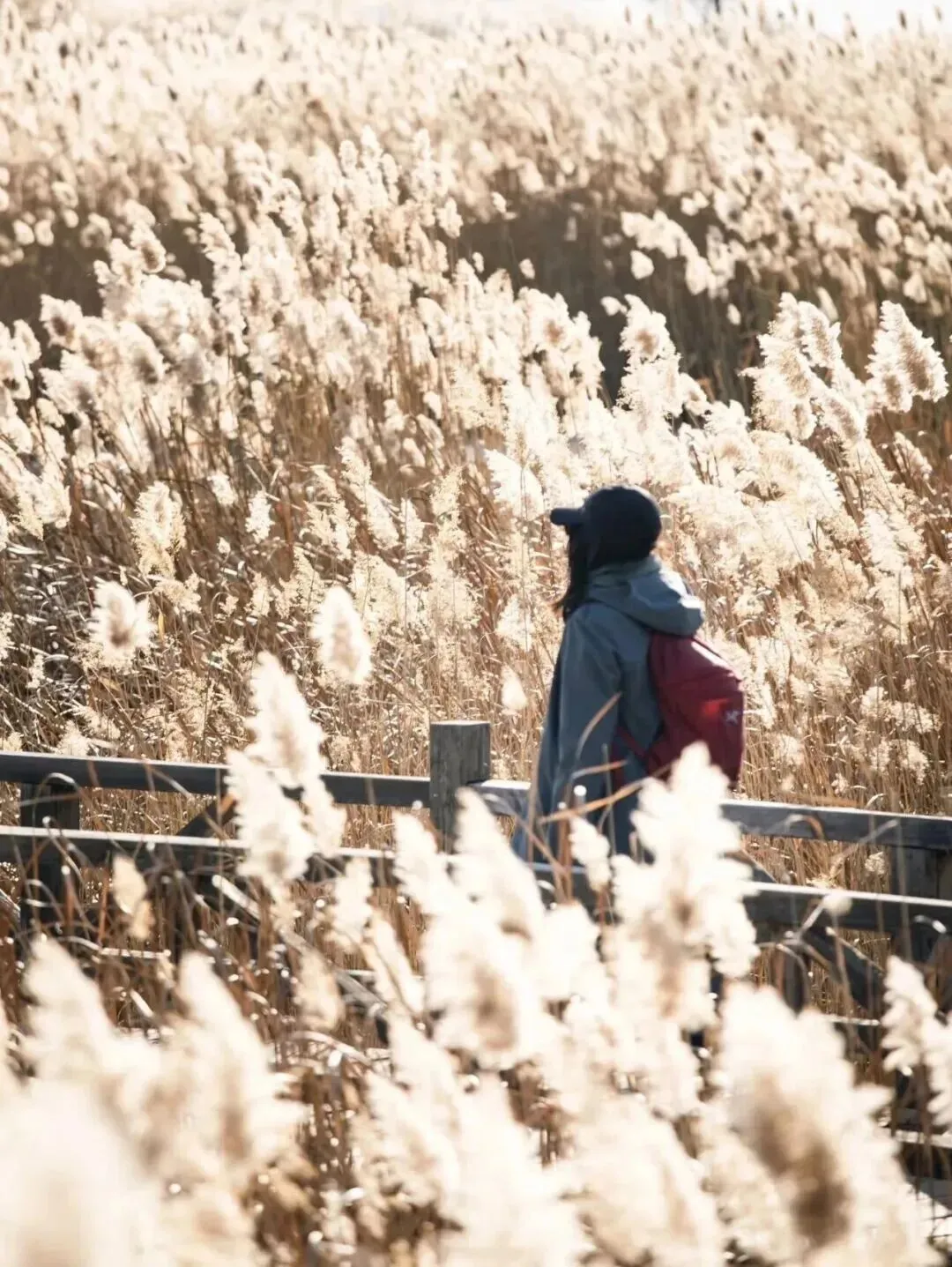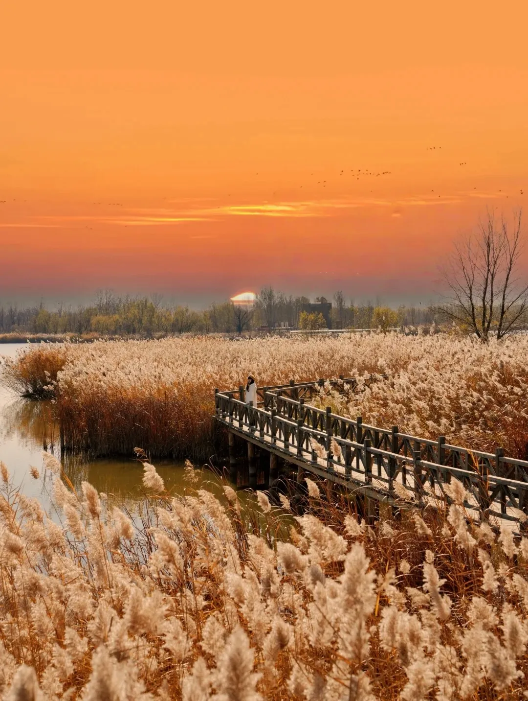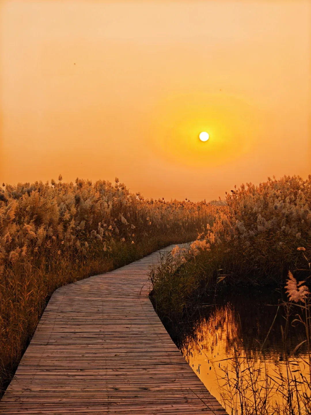 选择在芦苇荡中间的栈道上拍照,以芦苇和夕阳为背景,分分钟拍出大片。也可以蹲下来,用低角度拍摄芦苇和落日的倒影,超级有意境。