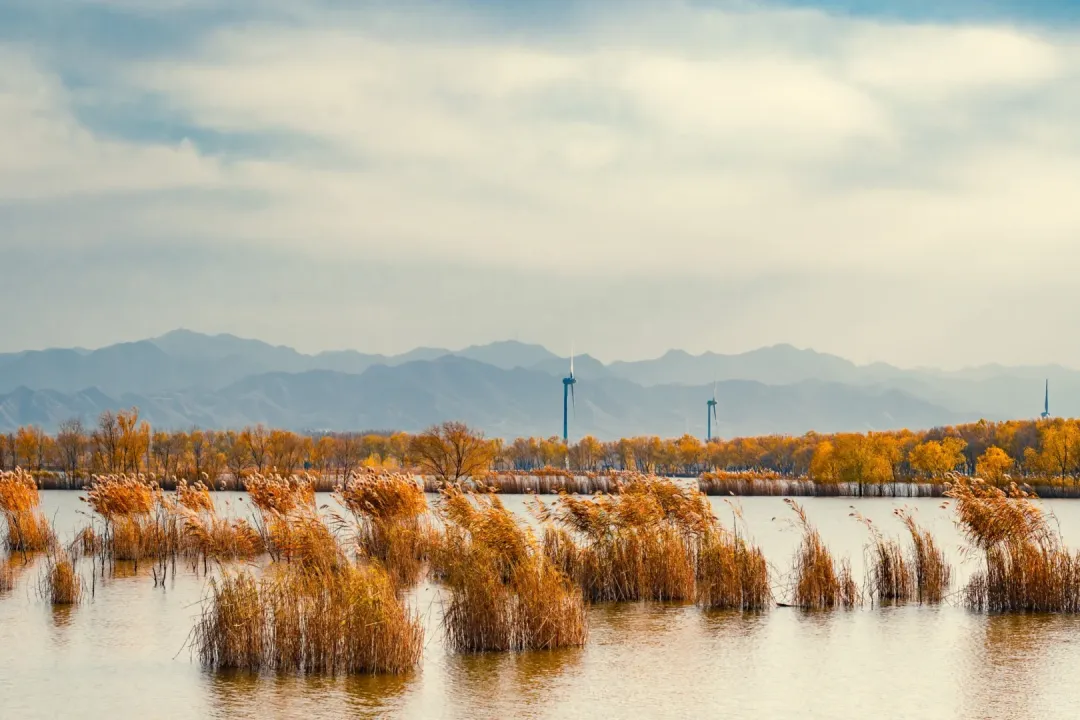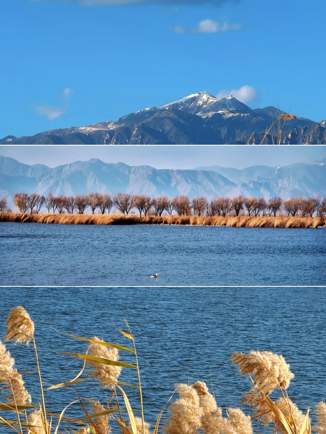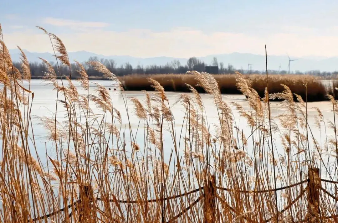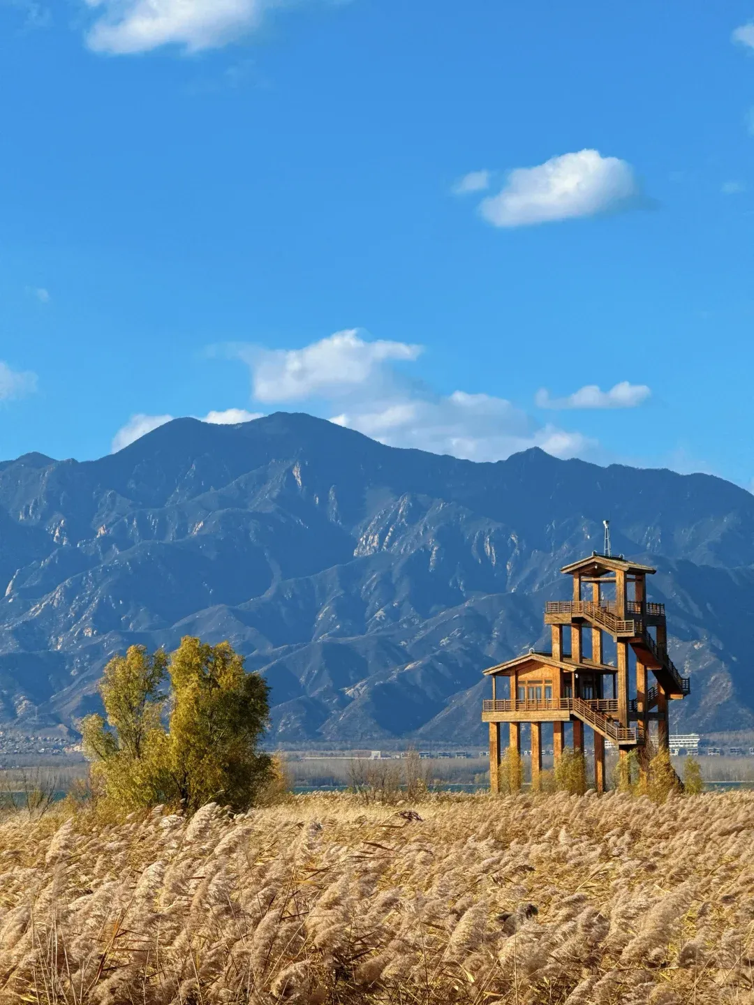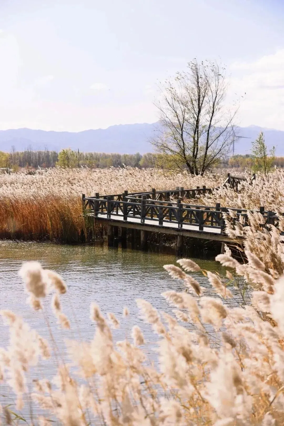 湖面湛蓝得像块宝石,远处海坨山覆着薄雪,阳光洒在雪道上化作“京郊日照雪山”,随手一拍都是无滤镜大片。沿着5公里环湖路漫步,脚下是松软的落叶,耳边是风声与候鸟低鸣,连片的芦苇荡掀起金色波浪,毛茸茸的穗子在风里摇晃,自带电影感柔光滤镜