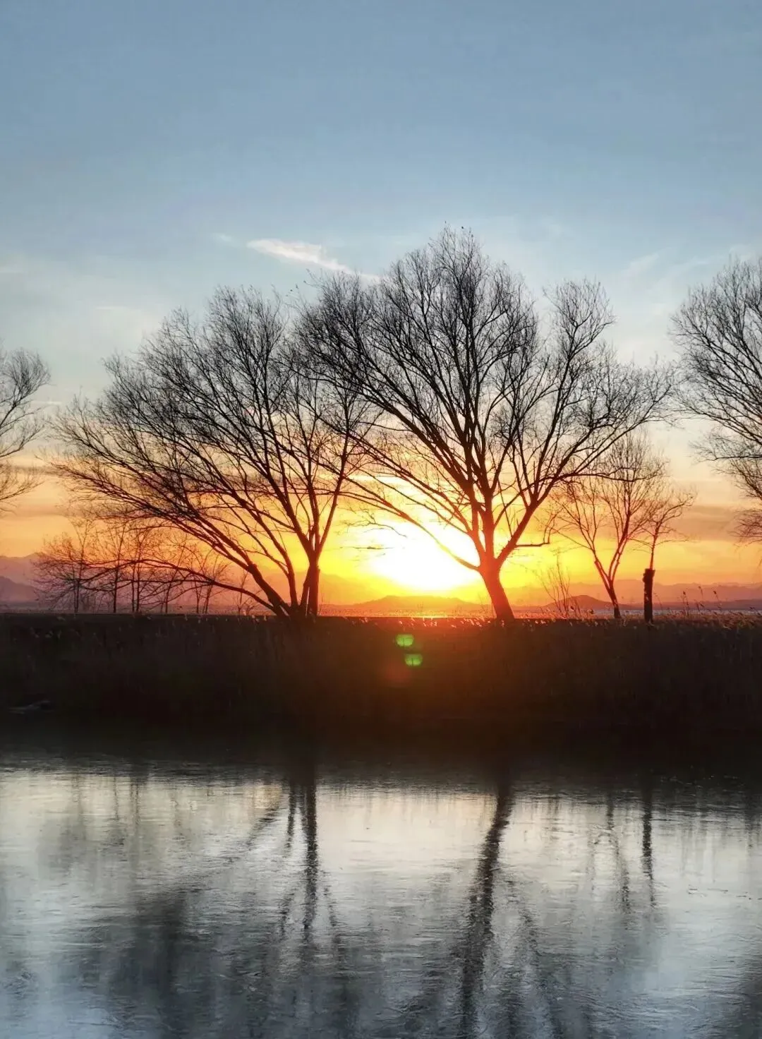 野鸭湖的绝美日落大片,太阳缓缓沉下时,整片湖面被染成了金红色,像洒满碎金的绸缎一样耀眼。湖里的栈道被淹到一半,只能在岸边走走,也因此看到了更多倒影与色彩的细节。