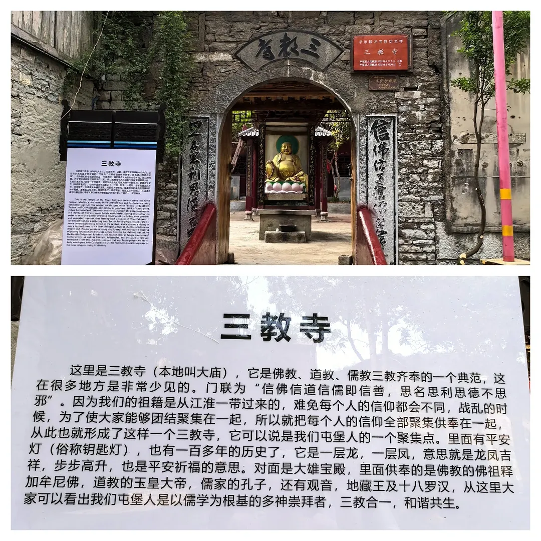 三教寺:由镇里居民自发筹资建立,正殿中并排供奉着释迦牟尼、孔丘和元始天尊的塑像。