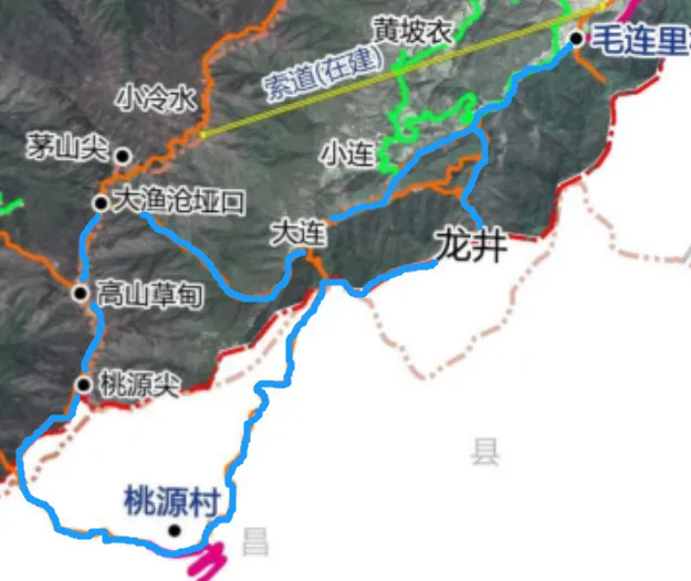 毛连里村—龙井—桃源村—桃源尖—大渔沧垭口—大连—小连—毛连里村(蓝色线路所示)