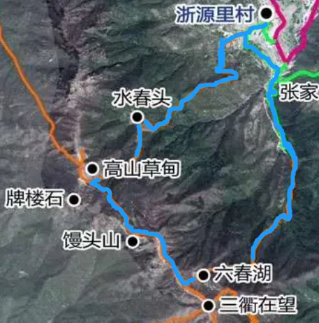 浙源里村—水春头—高山草甸—馒头山—六春湖—浙源里村(蓝色线路所示)