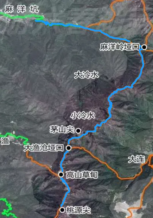 麻洋坑—麻洋岭垭口—茅山尖—桃源尖(蓝色线路所示)