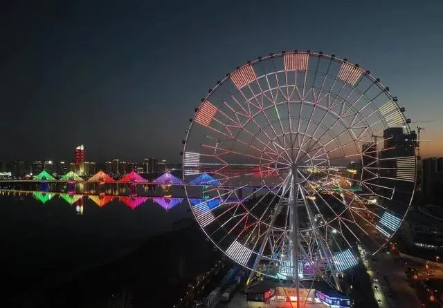 在赣江边上 , 几百米外就能感受到它的气势。 坐上去转到160米高空 , 俯瞰赣江和整个南昌城 , 夜景尤其美。 情侣打卡首选 , 一个人去也值 , 那视角真的很难得。