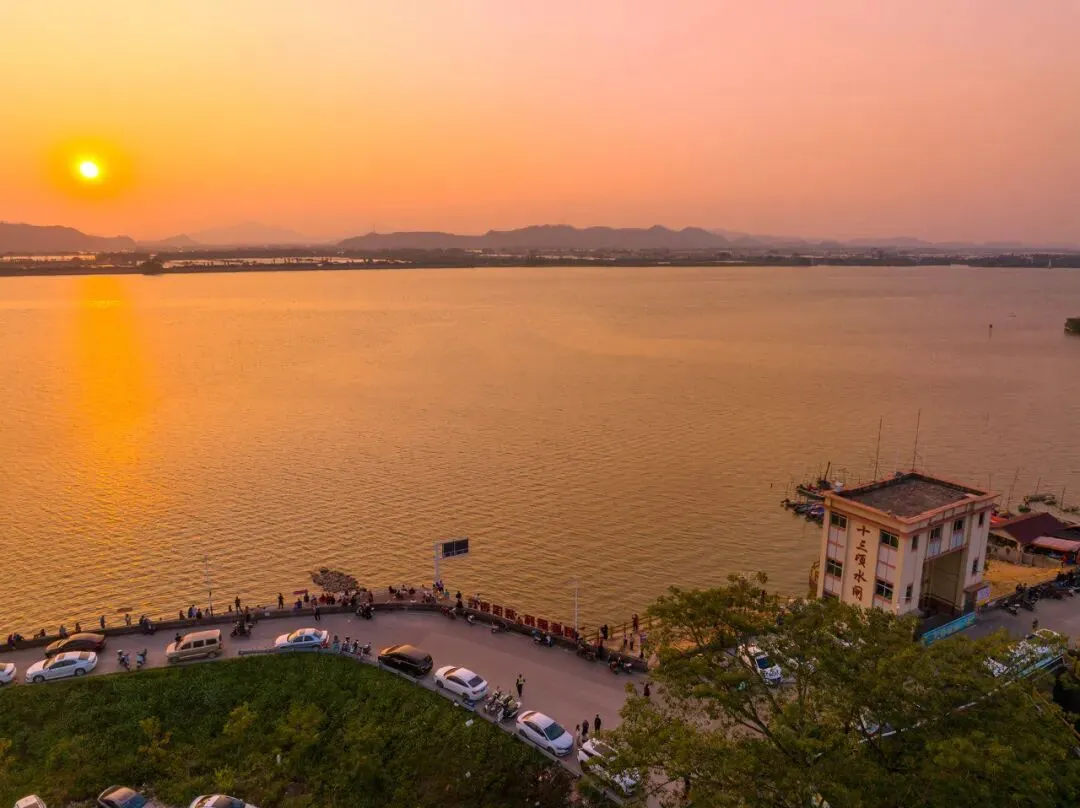 傍晚,十三顷水闸一带,站在新建成的“西江情”日落观赏平台,火红的落日让江面和海心沙鎏金逸彩,白鹭海鸥争着为孩子们欢歌,远处的航船构成一幅幅仿如“渔舟唱晚”“山映斜阳天接水”的水墨画……在小红书和抖音,板芙十三顷水闸被称为“中山绝美日落观赏地”。