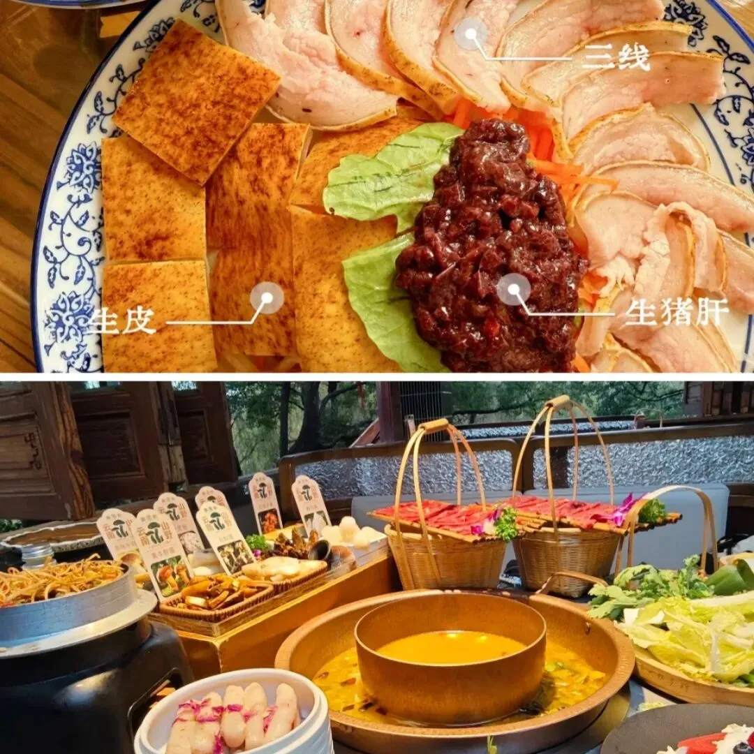 🥂白族生皮:趁新鲜将火烧猪肉分切成薄片或丝状,并配上特制的“灵魂蘸水”蘸食
