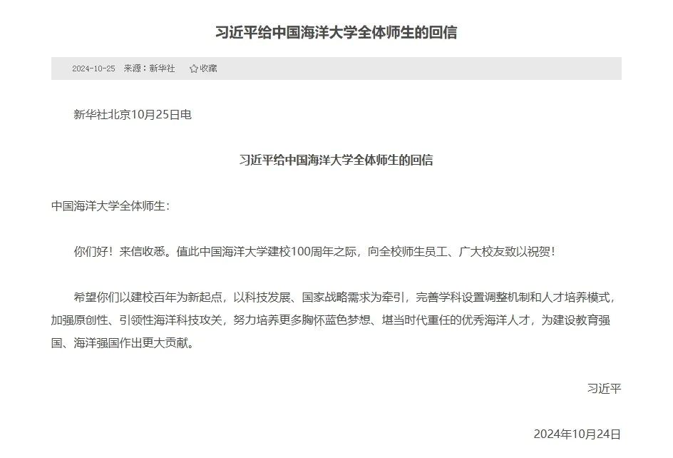 2024年10月25日,中国海洋大学的百年校庆,轰动四海。习大大还亲自致信祝贺,并勉励他们“加强原创性引领性海洋科技攻关,努力培养更多胸怀蓝色梦想堪当时代重任的优秀海洋人才”,令之受宠若惊,让其他高校羡慕不已。