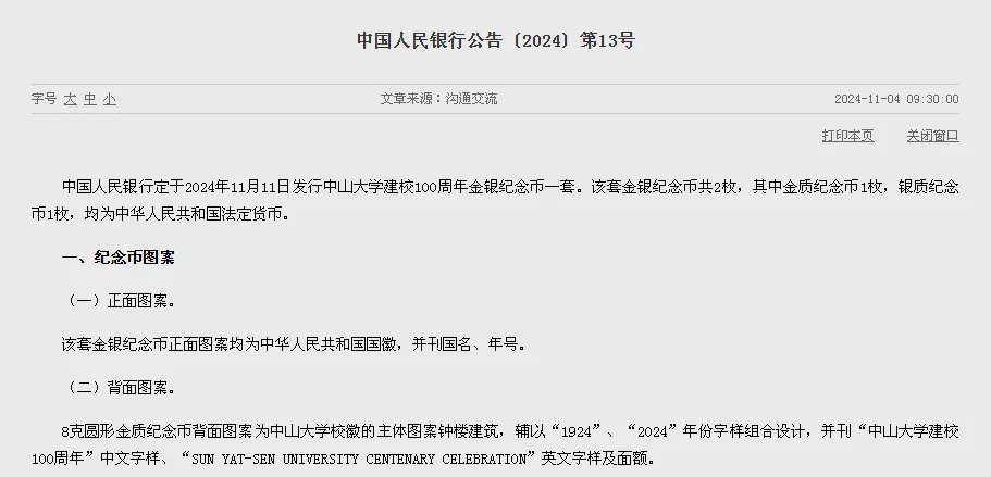 11月4日,为庆祝中山大学建校百年,中国人民银行定于2024年11月11日发行中山大学建校100周年金银纪念币一套。该套金银纪念币共2枚,其中金质纪念币1枚,银质纪念币1枚,均为中华人民共和国法定货币。此等殊荣,历史罕见。不禁让人慨叹,不愧是百年名校,国之成均。