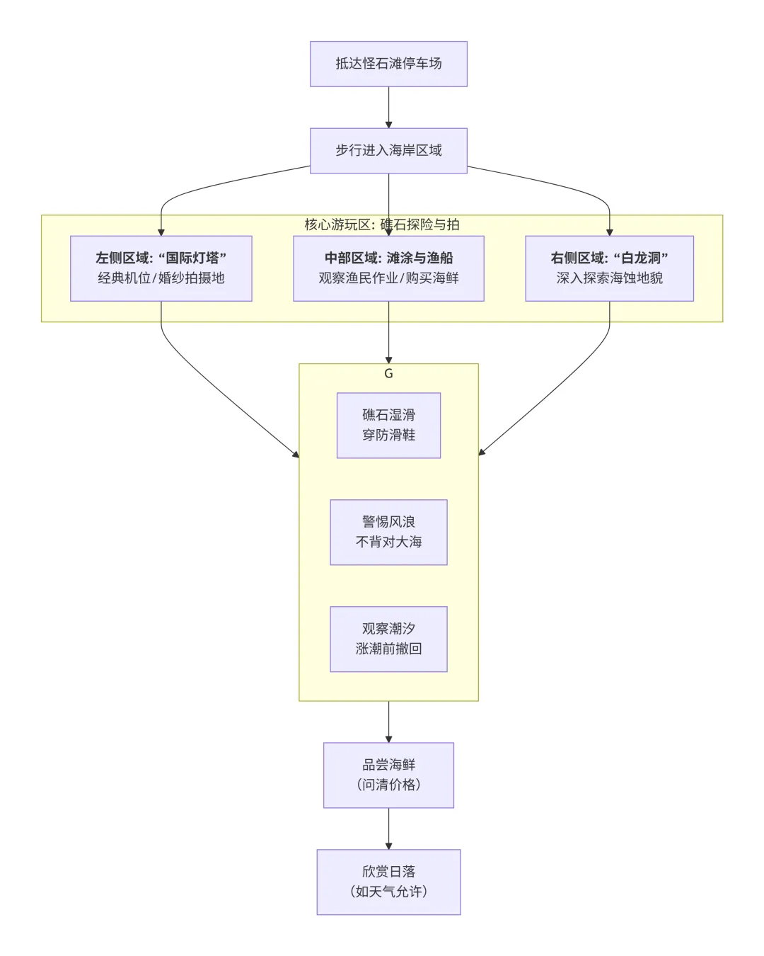 下图清晰地展示了怪石滩的核心游玩区域与安全注意事项: