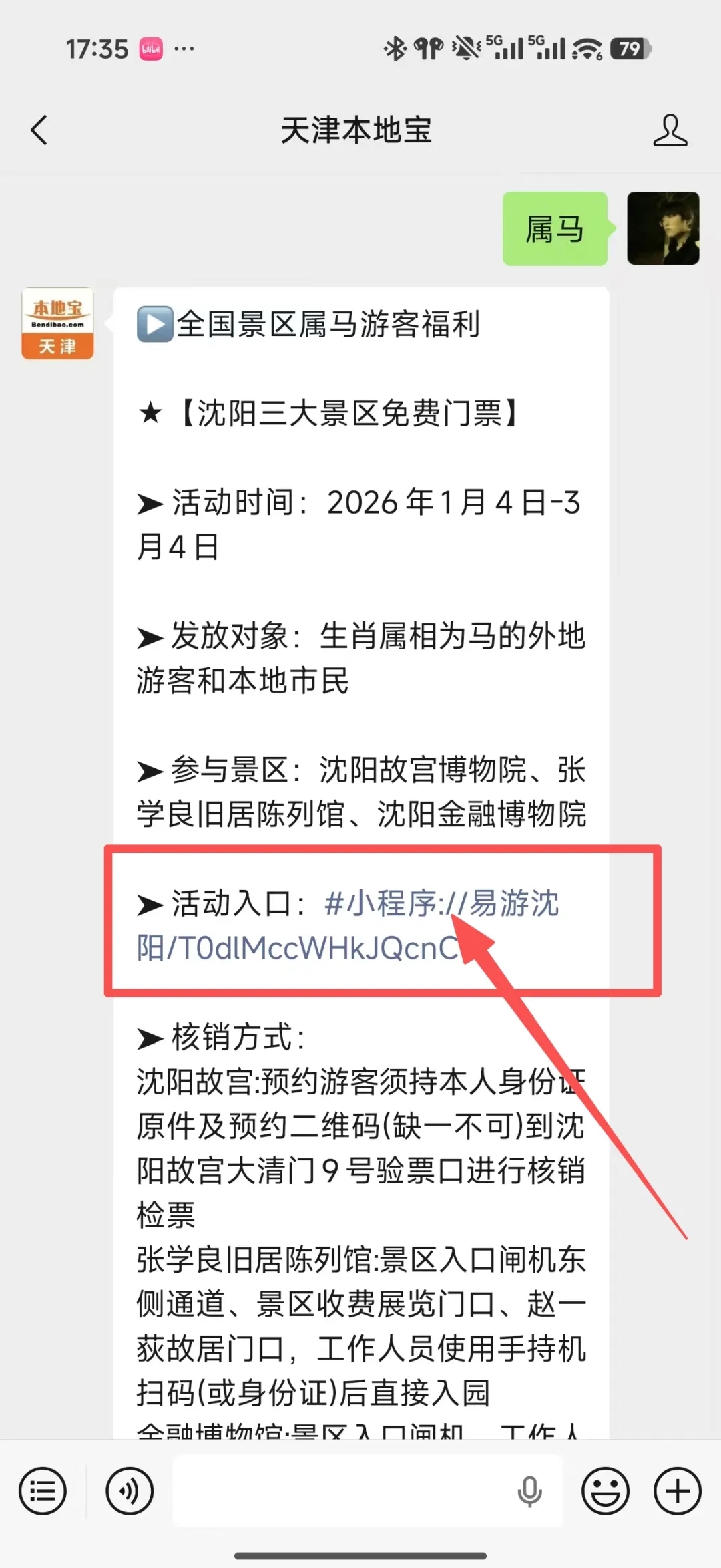 易游沈阳小程序或长按下方二维码,关注【天津本地宝】公众号,微信对话框回复【属马】即可获取活动预约入口