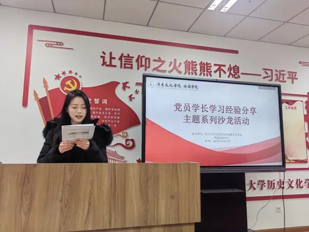 随后,主持人向在场师生介绍了本场分享嘉宾——郭蓓茹,历史文化学院(旅游学院、考古文博学院)2024级旅游管理专业硕士研究生,现任四川大学第九批研究生党员学长,曾获得四川大学二等学业奖学金。郭蓓茹学姐长期关注文旅行业发展,在思想理论学习、专业实践探索与学习方法构建等方面积累了较为系统的经验,其成长路径具有较强的示范意义与参考价值。