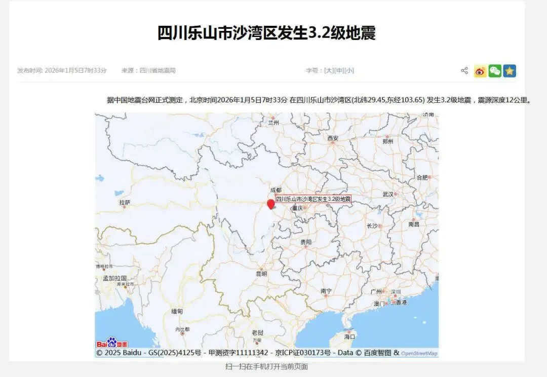 据中国地震台网发现,2026年1月5日7时33分,四川乐山市沙湾区(北纬29.45度,东经103.65度)确实发生过3.2级地震,震源深度12公里。