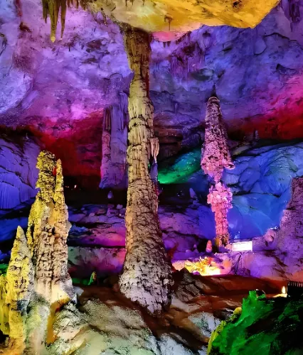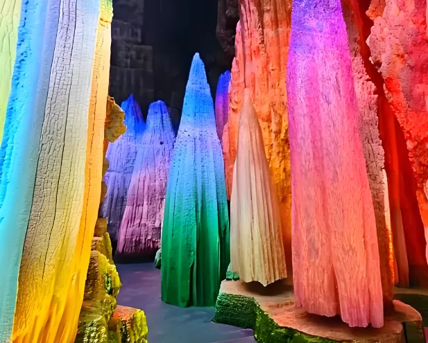 银子岩以“三绝”“三宝”闻名,建议乘船穿越地下暗河,全程1.2公里可观赏“音乐石屏”“瑶池仙境”等奇观。景区内“雪山飞瀑”钟乳石群如冰瀑垂落,成为游客打卡热点。开放时间8:30-17:30,门票65元含讲解服务。住宿推荐阳朔悦榕庄,步行10分钟即达景区,房价1000-2000元/晚含温泉。夜游可体验“印象刘三姐”山水实景演出,张艺谋导演的视觉盛宴不容错过。