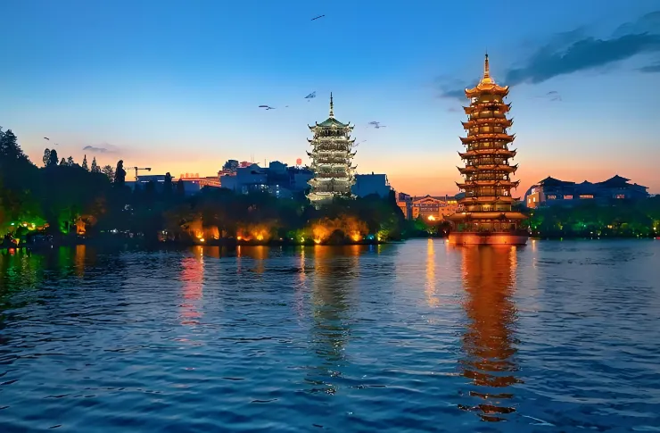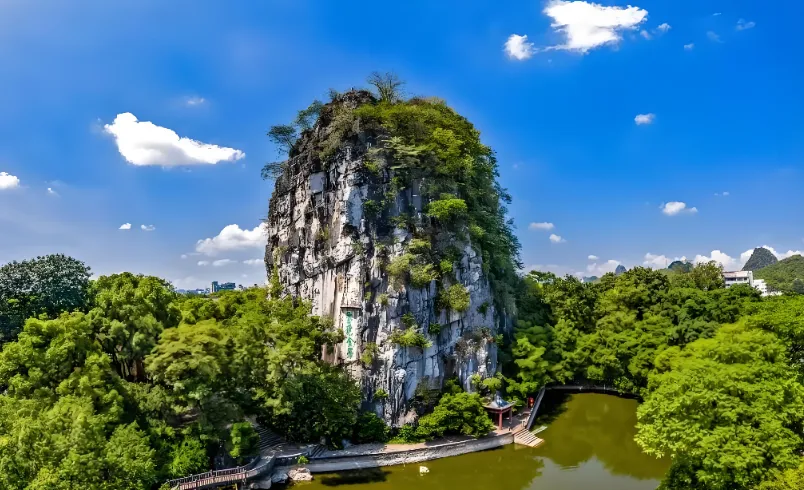象鼻山因酷似巨象饮漓江水而得名,建议从2号门进入,沿江步道步行15分钟即达核心观景台。景区内“普贤塔”为明代古塔,与象鼻山构成“宝瓶藏宝”的吉祥寓意。开放时间7:00-18:00,门票55元。住宿推荐桂林香格里拉大酒店,步行10分钟即达景区,房价600-1200元/晚含泳池。傍晚可至解放桥码头乘游船,欣赏“两江四湖”夜景灯光秀。