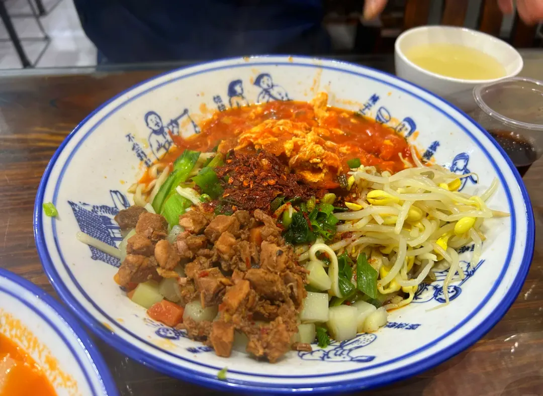 从武功县返回咸阳市区,夜幕渐垂,汇通十字的夜市已然热闹起来。这里是“中国最大的露天面馆”,几十个摊位一字排开,只卖汇通面,烟火气升腾在夜色里,成了咸阳独有的风景。老板抄起一把面条扔进大锅,煮得断生后过凉水,捞进铁盆,浇上滚烫的猪肉臊子,或是胡萝卜、土豆丁做的素臊子,撒上蒜苗、辣椒,一碗汇通面就成了。端着面蹲在街边,面条粗犷劲道,臊子香浓入味,吃起来带着西北人的豪爽。周围是熙熙攘攘的人群,有人三五成群举杯谈笑,有人独自埋头吃面,汇通面的香气里,藏着咸阳夜市的鲜活,藏着普通人的烟火欢喜。