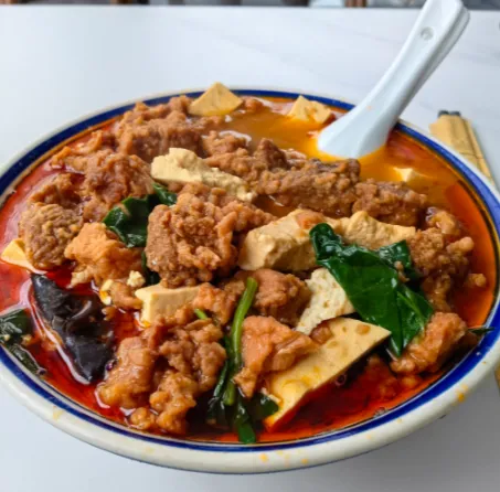 继续往长武县走,冬日的长武,塬上的风带着凛冽,却吹不散长武酥肉的香气。长武的小饭馆里,酥肉是必点的招牌。选上好的猪瘦肉,切成小块,裹上鸡蛋液、红薯淀粉,抓拌均匀后下锅炸至金黄,再码进碗中,浇上料汁蒸熟,最后配上青菜、豆腐烩煮,酥肉软烂入味,汤汁咸香醇厚,每一口都透着家常的温暖。老板说,长武人待客,总少不了一碗酥肉,这道菜里,藏着当地人的热情与实在,也藏着街头巷尾的烟火温情。