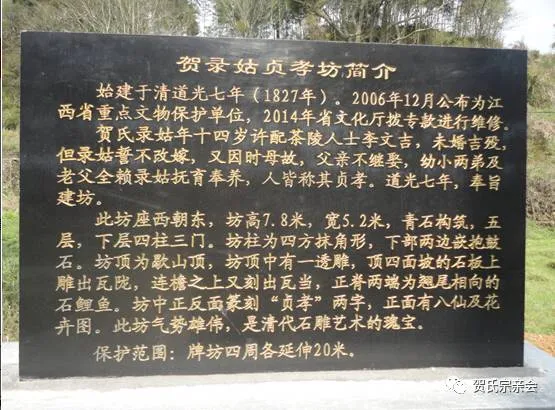 江西省莲花县荷塘乡安泉村长岭自然村的村口有一座牌坊,是清代道光丁亥年( 1827)建。此坊是旌表贺录姑贞孝坊。据族人介绍:贺氏录姑年十四岁许配茶陵人士李文吉,未婚文吉殁,但录姑誓不改嫁。又因当时母故,父不继娶,两弟幼小和老父全赖录姑抚育和奉养,人皆称其贞孝。