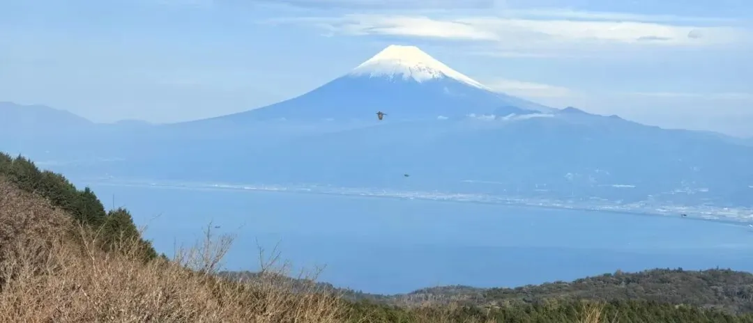 照例又是早上八点出发,九点多就到达摩山的观景台了。天气比较冷,穿了件微信视频号上的某直播间买的骆驼牌冲锋衣,防风效果还是不错的。 听姐夫介绍说,从达摩山观景台拍摄富士山全景,有山、有海、有城市,绝美。事实也确实如此。 虽然我的摄影水平比较差,但胜在景色绝美啊,随便拍都是壁纸啊。 看看,我把飞翔的小鸟都拍下来了,而且富士山还是盖帽的呢,且盖得还很好啊。上次有一篇小作文里提到过,要拍“盖帽富士山”给大家欣赏,这不,机会马上就来啊! 云层离山顶有一点点距离,这云、这雪山顶、飞翔的小鸟、大海、城市、近处的山,一切要素齐全,还都那么恰到好处。