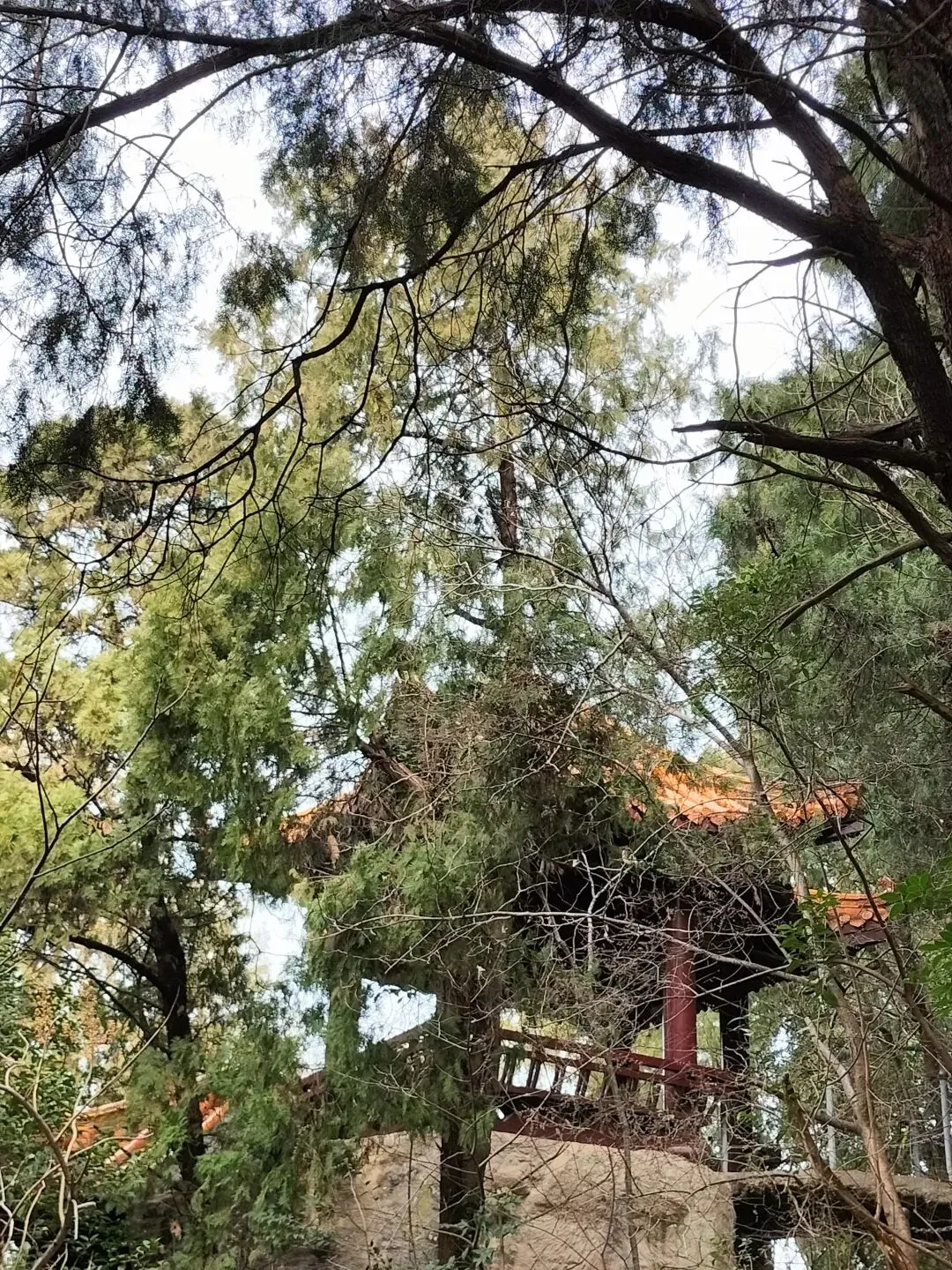 沿着路标箭头指示的方向,抬眼望去,青松翠柏环绕之中隐隐约约有一座依山而建,悬在半空的亭子。鹤归亭,建于2001年,命名源自苏轼《放鹤亭记》中“归来归来兮,西山不可以久留。”的名句。也借鉴了现代词人柳亚子“江山无恙鹤归来”的题词。