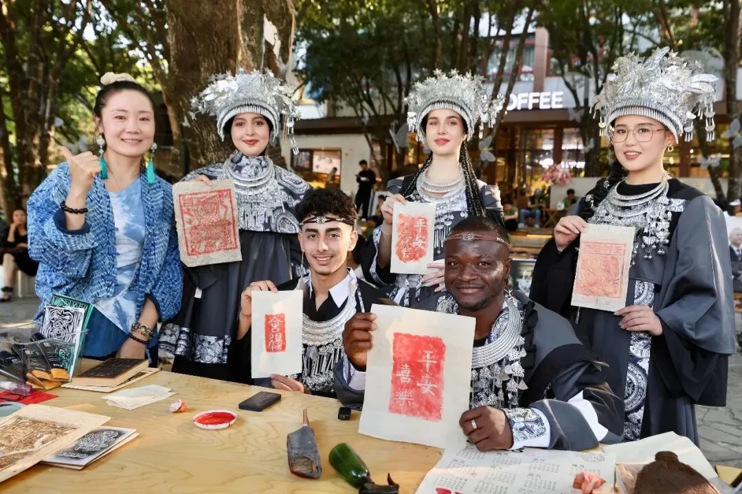 外国友人在广西桂林体验捞米粉拓印 视觉中国 供图
