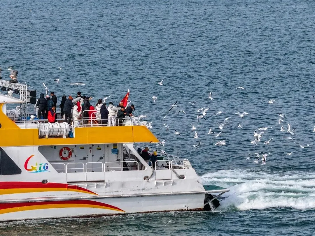 游客在山东青岛坐游船喂海鸥 视觉中国 供图