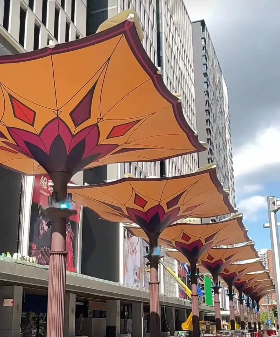 “我得时不时到深圳转转,不然发展太快找不着路了。”在东莞做跨境电商的林宇在社交媒体上留言,还配了一组前海交易广场国际化港风港味街区巨型天幕伞的照片。这批新型遮阳景观设施“膜结构伞”,复刻沙特的“变形黑科技”,不仅能智能开合,还加装冷雾系统、雨水收集装置,甚至自带氛围灯照明灯和音响系统,是妥妥的“室外空调”。
