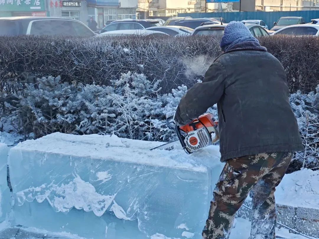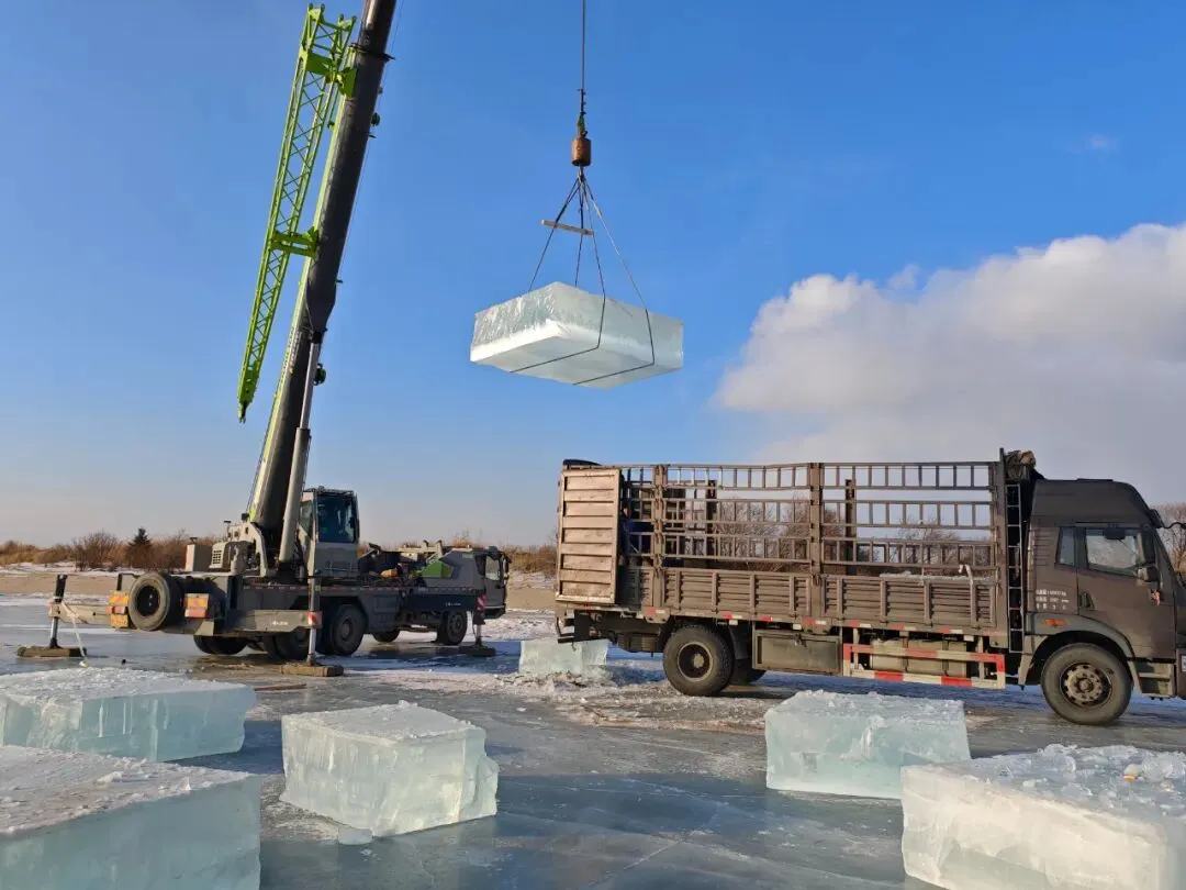 寒风凛冽,数十名采冰工人分工协作,有序作业。电锯声轰鸣,刀锋快速切入厚厚冰层,冰屑如雾飞扬;冰镐与凿斧的敲击声此起彼伏,冰花四溅,宛如琼玉绽裂。随着切割声打破湖面的寂静,一块块晶莹的冰块被缓缓托起,它们曾为湖中跃动的浪花,如今化作大自然馈赠的璀璨瑰宝。工人们将冰块切割成统一规格的方体,再用铁钩协力将其拖出水面,经过个滑道推至传送装置,随后,运输车辆将这些冰块陆续运往我市各主要景点,成为即将与公众见面的冰雕原材料。这些来自兴凯湖的冰块,承载着湖水的记忆与奔腾的生机,将在冰雪匠人的精心雕琢下,蜕变为梦幻般的艺术之作,点亮这座边陲小城的冬日夜晚。