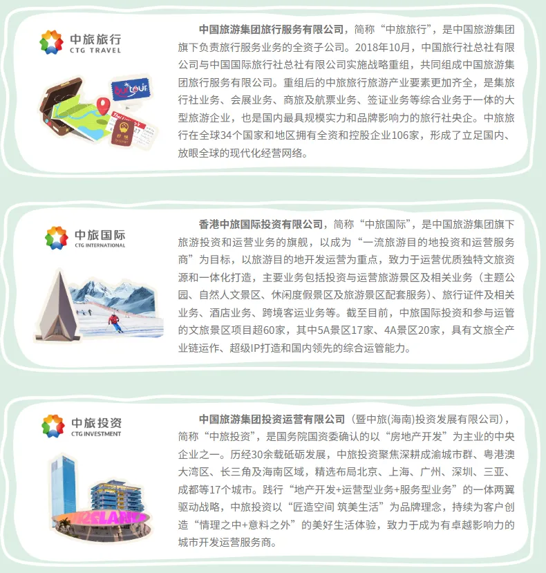 中国旅游集团有限公司坚持“诚信经营、优质服务”理念,以“旅游报国,服务大众”为使命,“立足香港、深耕海南、拓展内地、做精海外”,聚焦增强核心功能、提高核心竞争力,创造快乐体验,服务美好生活,努力成为“产品卓越、品牌卓著、创新领先、治理现代”的世界一流旅游产业集团。
